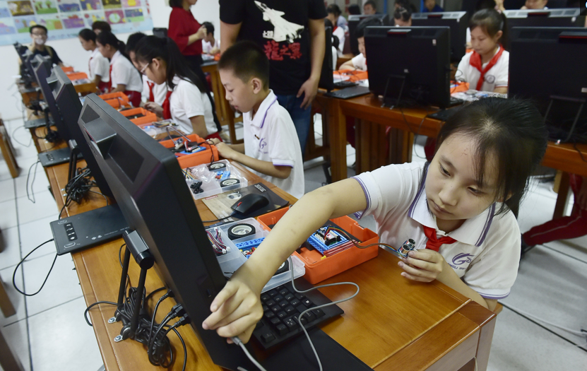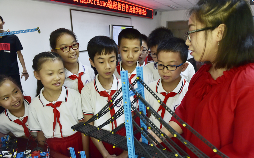 该校信息技术科目教师郭紫怡告诉记者:“我们通过让学生认识软件、知道界面,传达编程思想,编程后,把编好的程序考到固件上,通过传感器和控制器去操控小鸟上下飞动,这其实就是人工智能入门的一个环节,和机器人的逻辑是一样的,机器人也是我们给它设定好一个程序,然后它再根据指令去执行。”